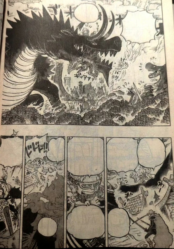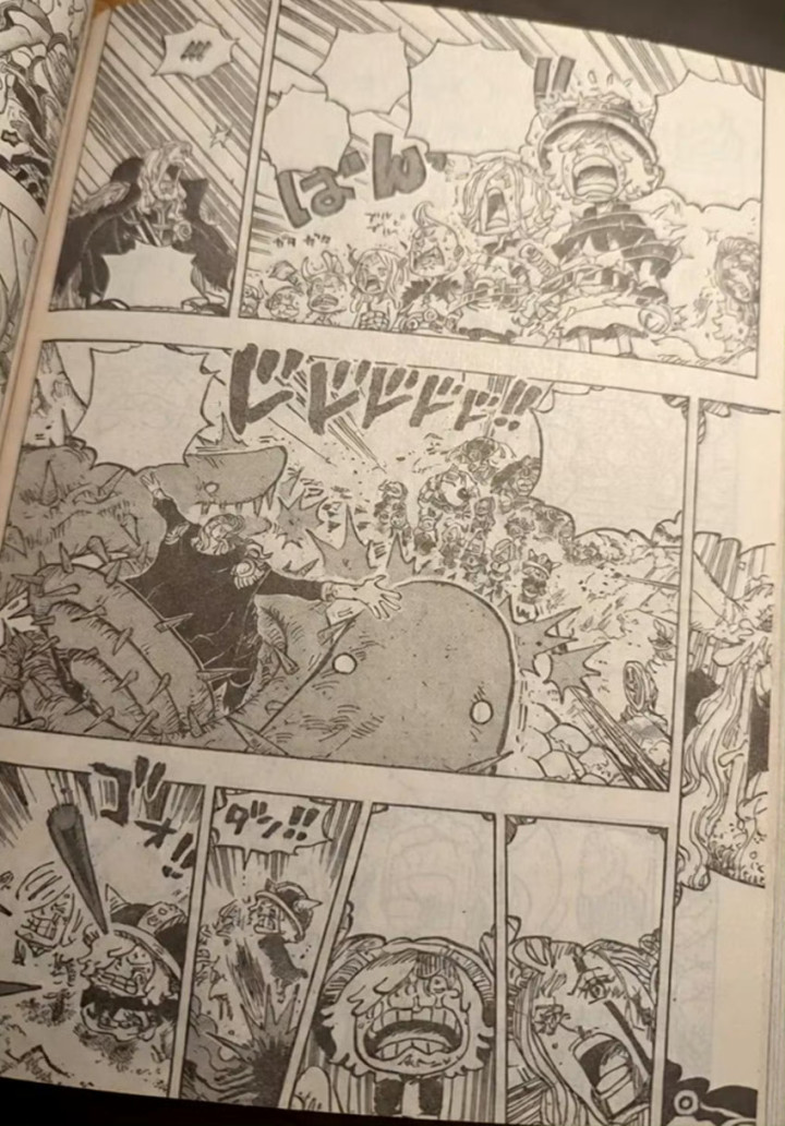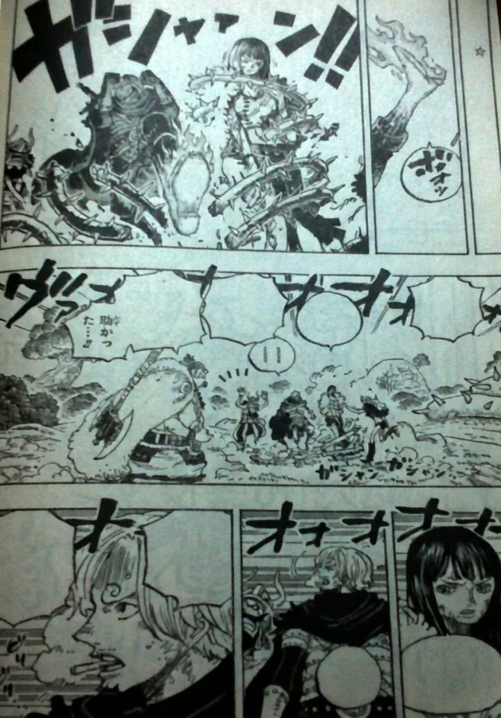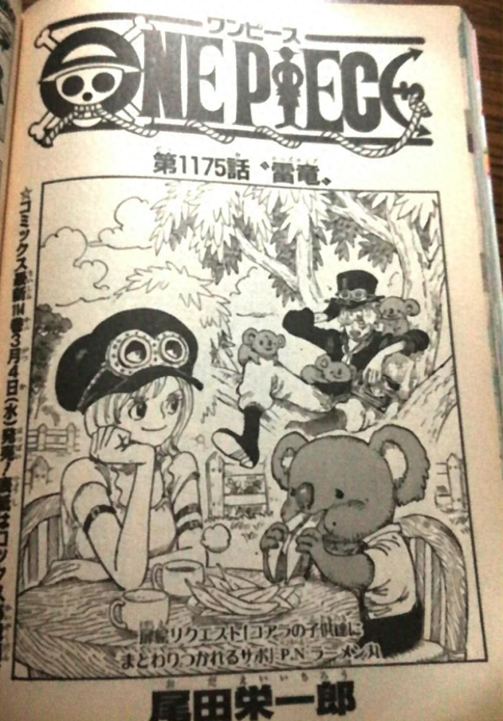 漫画最新一话的标题是雷龙,扉页小故事是萨博被一群小考拉包围,克拉尔和一只大考拉坐在一起吃东西。山治已经跑去营救罗宾,他使用了恶魔风脚踢中了索玛兹圣的荆棘,罗宾成功被救出来了,众人很开心,知道荆棘怕火。