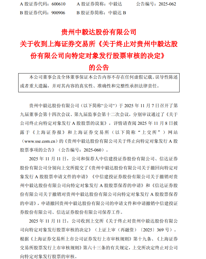 2025年11月11日,公司收到上交所《关于终止对贵州中毅达股份有限公司向特定对象发行股票审核的决定》(上证上审(再融资)〔2025〕369号)。根据《上海证券交易所上市公司证券发行上市审核规则》第十九条、《上海证券交易所股票发行上市审核规则》第六十三条的有关规定,上交所决定终止对公司向特定对象发行股票的审核。